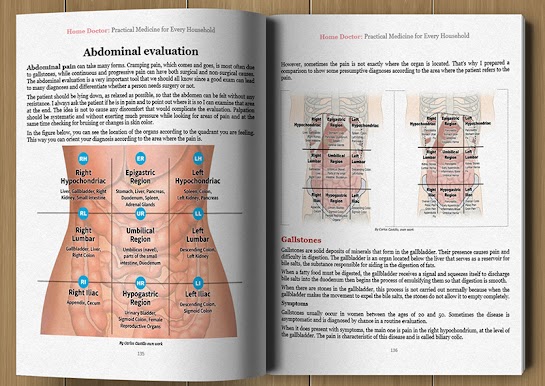Inside the Home Doctor, you’ll have a complete diagram with nine sections of the abdomen that, upon palpation, should reveal where the problem is.